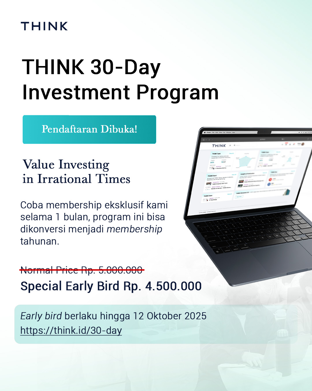 You will obtain access to THINK Research, which provides comprehensive stock analysis, monthly workshops, investment ideas, weekly insights and articles, and an investment dictionary covering 500 companies listed on the IDX.